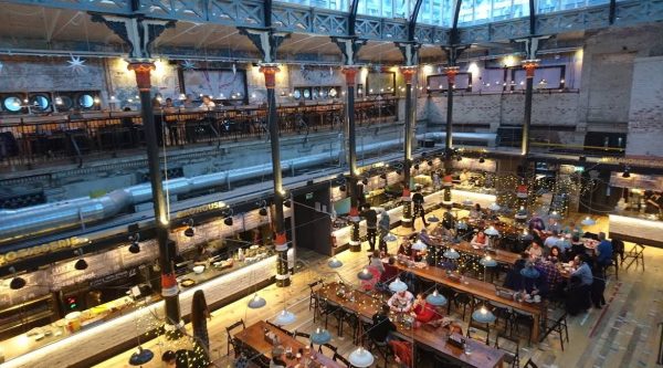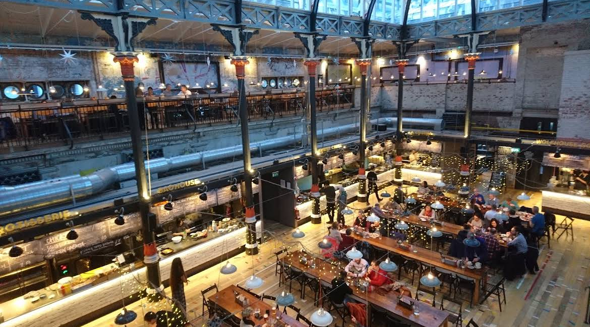 سوق طعام عصري يقع في مبنى تاريخي، يقدم مأكولات طازجة من جميع أنحاء العالم، مع أجواء رائعة لتناول الطعام والاستمتاع بالتسوق في نفس الوقت.