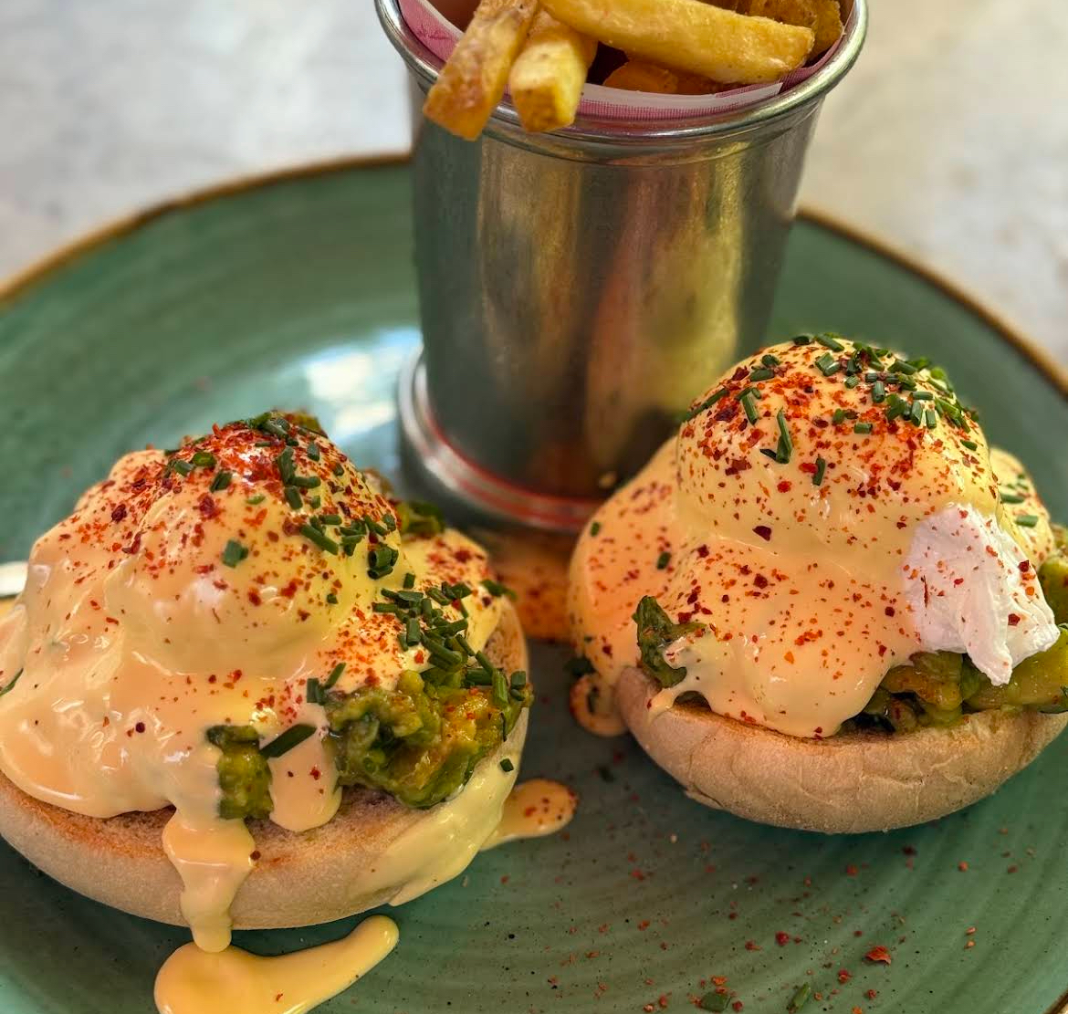 مطعم فطور بريطاني وأمريكي يقدم أطباق مبتكرة مثل وافل الموز والكراميل، تجربة فريدة مع ديكور مرح وجو دافئ.